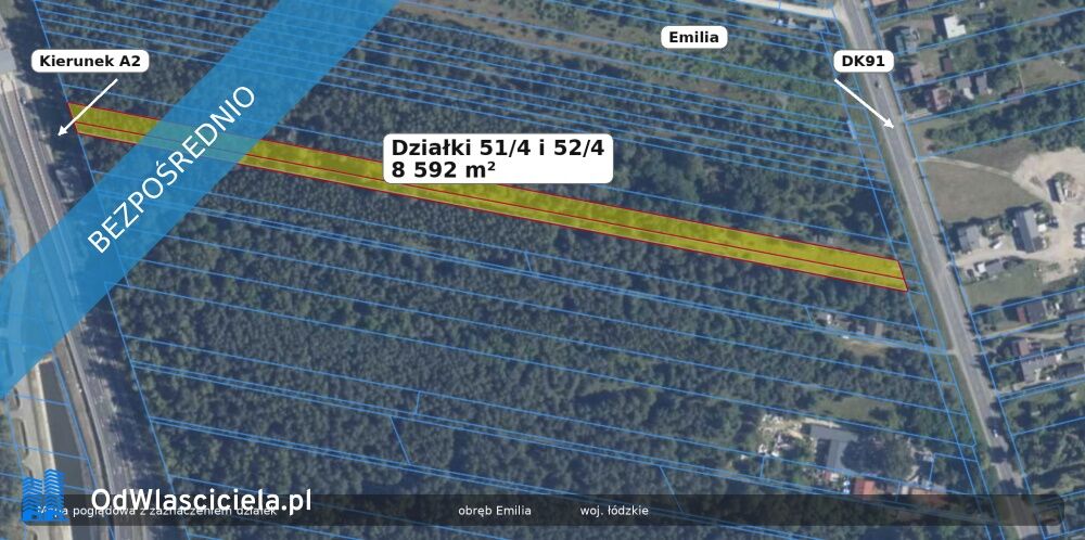 Na sprzedaż działka inwestycyjna położona w miejscowości Emilia, w bardzo dobrej lokalizacji komunikacyjnej – pomiędzy drogą krajową DK91 Zgierz–Ozorków a wjazdem na autostradę A2. Nieruchomość stanowi interesującą propozycję dla inwestora poszukującego gruntu z dogodnym dojazdem oraz przeznaczeniem wynikającym z miejscowego planu zagospodarowania przestrzennego. Podstawowe informacje o nieruchomości: łączna powierzchnia: 8 592 m² wymiary działki: około 16 m szerokości i 537 m długości teren składa się z dwóch sąsiadujących ze sobą działek: 51/4 – powierzchnia 5 701 m² 52/4 – powierzchnia 2 891 m² struktura gruntu: grunty rolne – 6 926 m² las / teren zadrzewiony – 1 666 m² Przeznaczenie terenu: Działka jest objęta miejscowym planem zagospodarowania przestrzennego – uchwała nr XXXVI/322/05 Rady Gminy Zgierz z dnia 19.10.2005 r., plan zagospodarowania przestrzennego dla Emilia – Zachód, z przeznaczeniem 4P. Atuty nieruchomości: bardzo dobra lokalizacja przy głównych trasach komunikacyjnych, dostęp do drogi publicznej od strony DK91 Zgierz–Ozorków, teren niezabudowany, nieogrodzony i nieuzbrojony, działka płaska, brak słupów, rowów, skarp, linii energetycznych oraz stref ochronnych, uregulowany stan prawny, nieruchomość wolna od hipotek, zadłużeń, wierzytelności oraz roszczeń osób trzecich, jeden właściciel. Charakterystyka terenu: od strony drogi krajowej DK91 na długości około 426 m znajduje się teren rolny klasy V i VI, od strony drogi wjazdowej na A2 na długości około 111 m działka jest zadrzewiona. Stan prawny: Nieruchomość ma uregulowany stan prawny, nie jest przedmiotem postępowań cywilnych ani administracyjnych oraz nie jest obciążona ograniczonymi prawami rzeczowymi. Cena: 99 zł / m² 850 608 zł za całość Działka może stanowić ciekawą propozycję dla inwestora szukającego gruntu w lokalizacji z szybkim dojazdem do autostrady A2 oraz dobrym połączeniem z Łodzią i okolicami.Numery Ksiąg Wieczystych: 51/4 – LD1G/00031520/5 ; 52/4 – LD1G/00031618/9